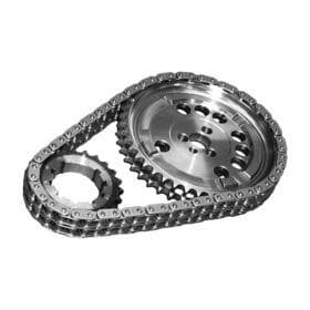 This double-roller timing-chain set contains an adjustable, nine-keyway nitrated crankshaft sprocket; a double-row chain; a nitrated camshaft sprocket; two oil-pump-spacer plates; detailed instructions.