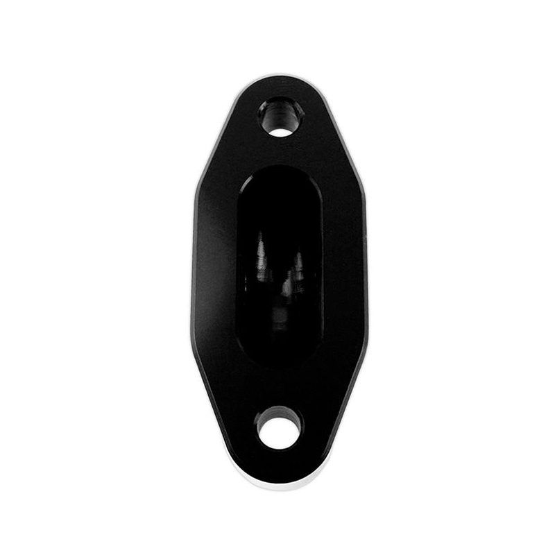 The bypass cover is CNC-machined from billet 6061-T6 aluminum and Type II anodized in black. It features a large ported internal cavity with smooth features to improve flow characteristics when compared to the factory diecast bypass cover.