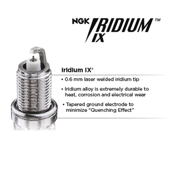 NGK Iridium IX Spark Plugs Utilize A 0.6 Mm Iridium Center Electrode & Taper Cut Ground Electrode For Faster Starts, Better Acceleration & Improved Anti-Fouling. They Also Feature Trivalent Shell Plating For Superior Anti-Corrosive & Anti-Seizing Properties.