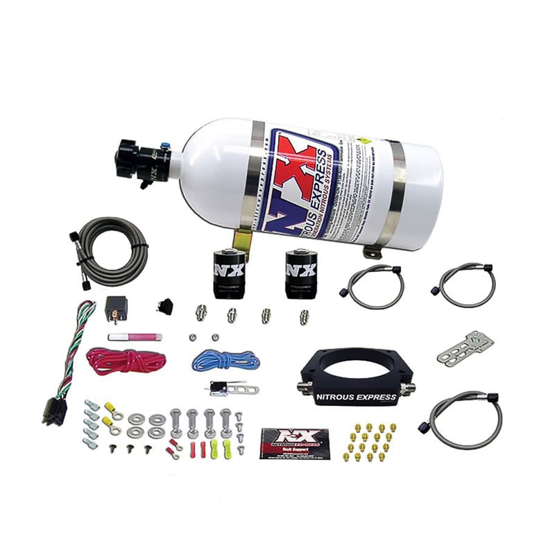 The plate is pre-machined with a second set of nitrous and fuel passages so you can easily upgrade to a dual stage system by adding part # NX933D. This system includes ProPower Lightning series solenoids, systems with a bottle include the Lightning 500 bottle valve, 6AN feedline, braided stainless solenoid to plate lines, stainless bottle brackets, master arming switch, WOT switch as well as every nut, bolt and electrical connector needed to complete the installation.