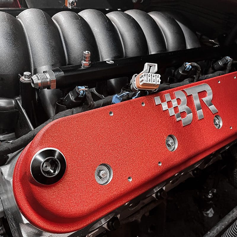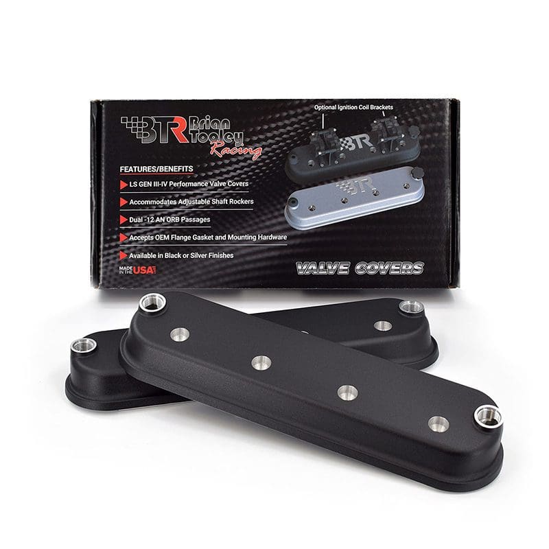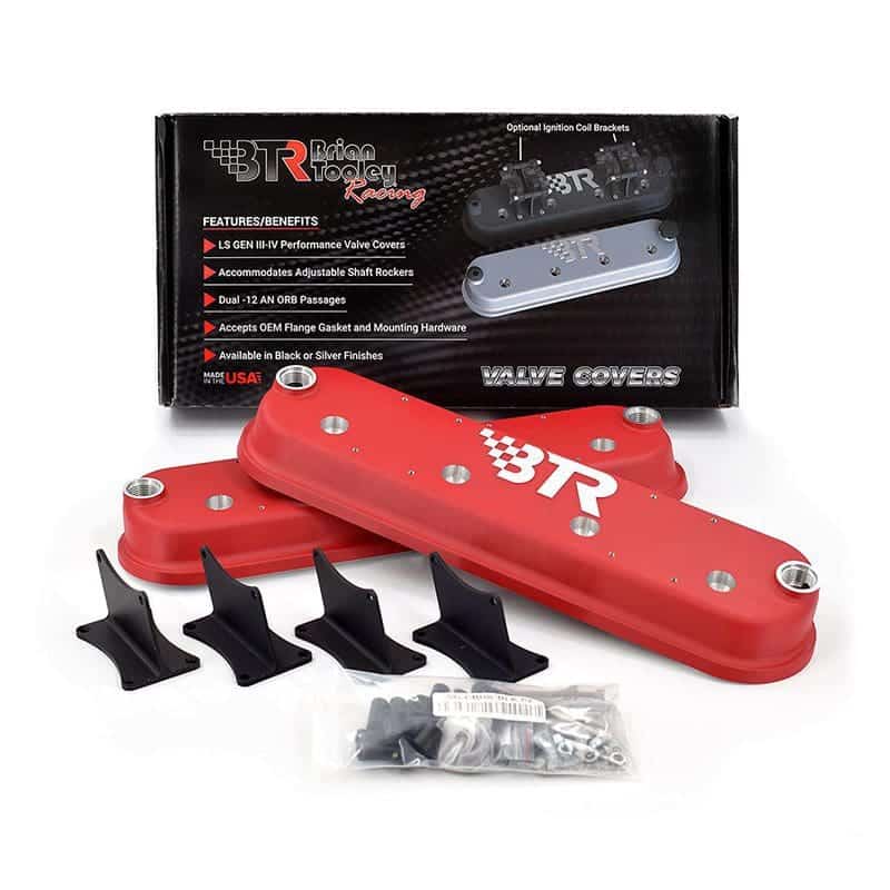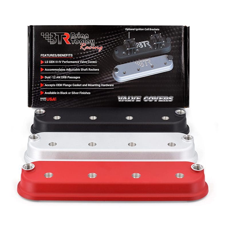 BTR valve covers retain stock mounting height and allow the use of OE style GM gaskets and bolts, while being molded in a unique plane to allow nose clearance for shaft rockers. With -12AN ORB vents on both ends, you have a wide variety of options for catch can or vacuum pump plumbing. Also featured is a unique baffle design/splash guard that protrudes below the valve cover surface. Die cast aluminum and available in 3 colors – silver, black, red – with and without coil mounts.